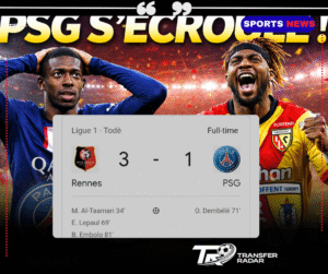 Dans une soirée qui pourrait bien marquer un tournant décisif de la saison de Ligue 1, Paris Saint-Germain a été sévèrement battu 3–1 par Stade Rennais, laissant la place grande ouverte à RC Lens dans la course au titre. Cette défaite retentissante loin de leurs bases n’est pas simplement une erreur : c’est un moment historique qui redistribue les cartes — et les espoirs — dans la lutte pour le Scudetto français cette année.