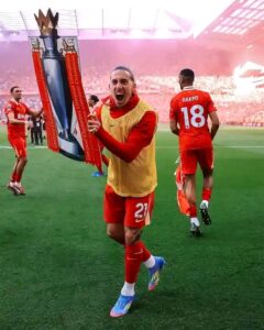 Parade Route: Anfield → City Centre → Baltic Triangle. Fireworks at 8 PM. Slot lifts the trophy in Klopp’s iconic coat, fans chanting every anthem.